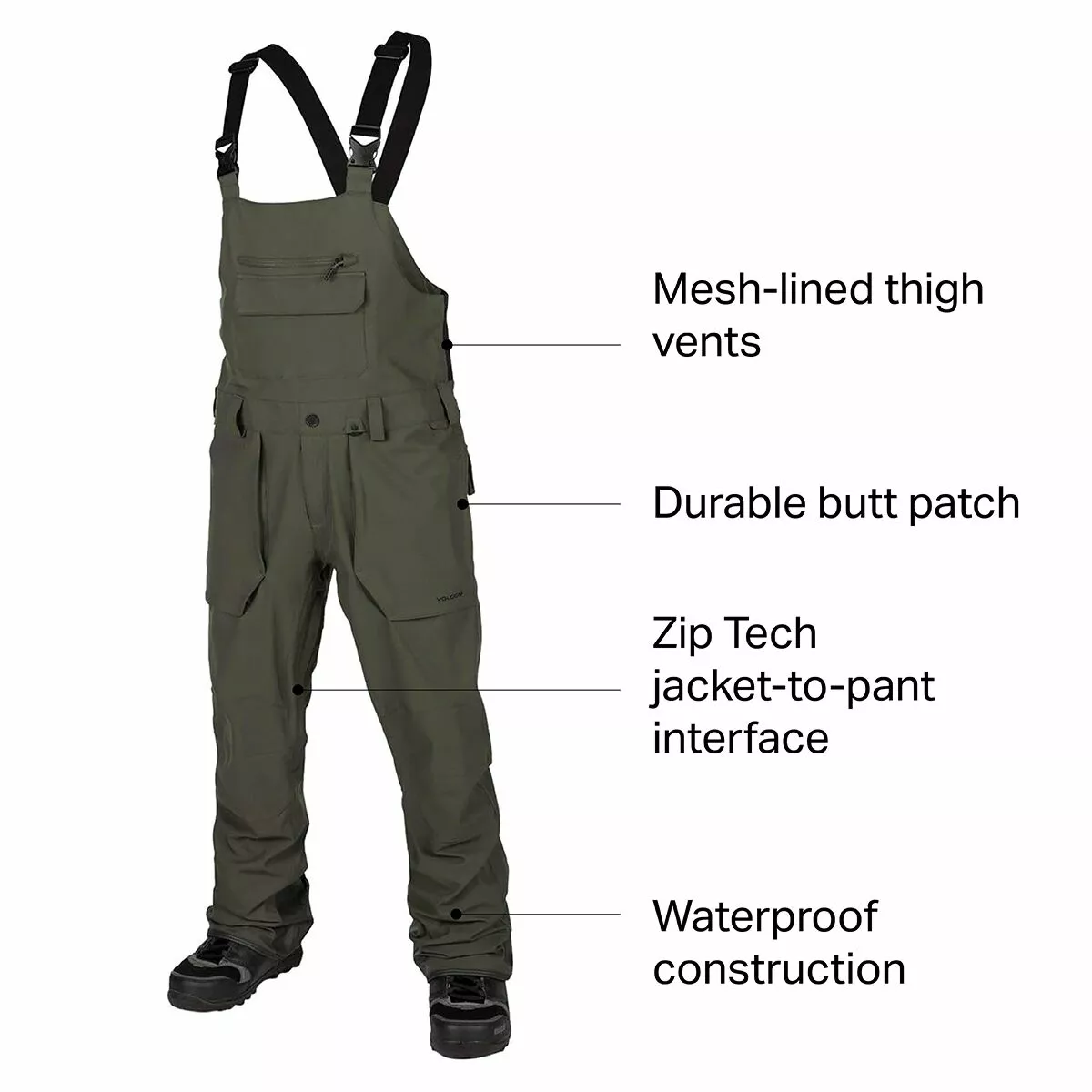 Let your inner farmer loose while keeping snow at bay with the Volcom Men’s Roan Overall Pant. This bib pant prevents snow from getting in on chest-deep powder days, and it also works well over a hoodie for slushy spring park laps. V-Science fabric shields you from wind and snow, while the V-Science lining system optimizes breathability where you need it most so you stay comfy whether you’re riding the lift in a storm or hiking a rail in the sun. Mesh-lined inseam vents help you cool off quickly when it’s warm out, while boot gaiters block out snow on powder days. Zip Tech compatibility also allows you to link the Roan up to your Volcom jacket to create the ultimate snow-proof shield in stormy conditions.
